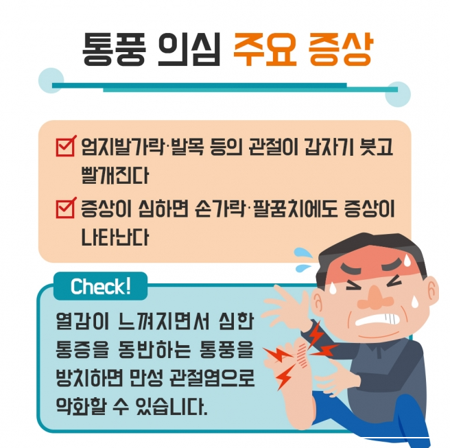 적절한 체중 관리도 매우 중요한데, 비만은 통풍 발작 위험을 크게 증가시키므로 규칙적인 운동과 건강한 식단으로 정상 체중을 유지하셔야 해요.