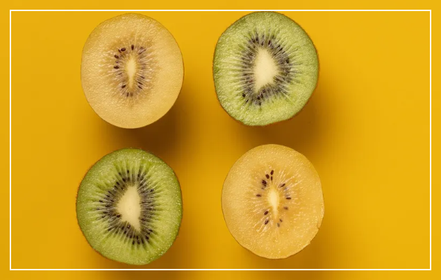 키위는 아미노산, 판토텐산, 티로신 함유량이 많아서 '미용 과일'이라고 불릴 정도로 피부 건강에 좋은 효과가 있어요. 키위에 풍부한 비타민C는 콜라겐 합성을 도와주고 피부에 수분을 유지시켜주는 역할을 하는데, 성인 기준 하루 권장량의 2배 이상이 들어있답니다.