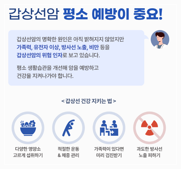 갑상선암은 조기 발견과 적절한 예방이 정말 중요한 질환이에요. 무엇보다 규칙적인 생활습관과 건강한 식단이 갑상선암 예방의 기본이 된다는 점을 꼭 기억해주세요.