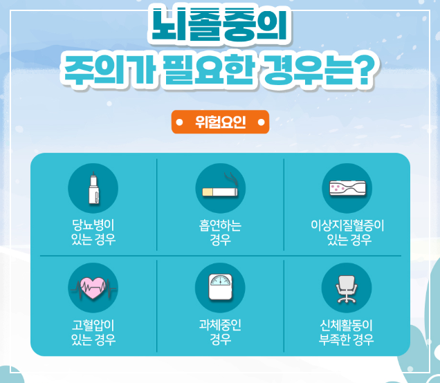 평소 건강하게 생활하시는 분도 고혈압, 당뇨병, 스트레스, 흡연, 음주 등 다양한 원인으로 뇌출혈 위험이 높아질 수 있으니, 오늘 알려드릴 증상들을 꼭 기억하셔서 내 몸의 온 신호를 놓치지 않으시길 바랍니다.