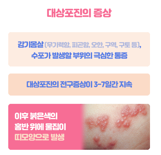 주로 옆구리, 가슴, 등, 얼굴 한쪽에 많이 발생하며 몸의 중심선을 넘어 양쪽으로 퍼지는 경우는 거의 없어요. 이 붉은 반점이 나타나면 곧 물집으로 변하게 되므로, 이 단계에서 빠르게 치료를 시작하는 것이 중요해요.