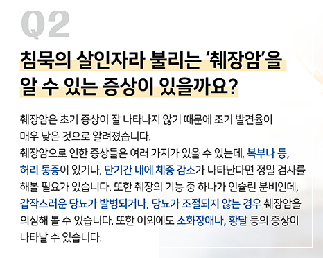암 때문에 췌액 분비가 적어지면서 영양소 흡수 장애가 생기고, 식욕 부진과 통증으로 인한 음식물 섭취 감소가 원인이 되죠. 췌장암은 체력을 소모시켜 몸을 전체적으로 쇠약하게 만드는 질병이기 때문에, 특별히 체중관리를 하지 않았는데도 급격한 체중 감소가 있다면 꼭 검사를 받아보셔야 해요.