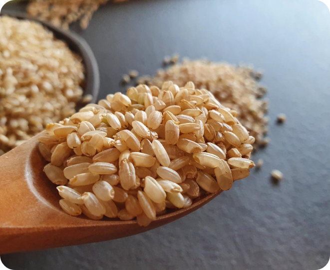 현미는 백미의 겉껍질만 벗긴 통곡물로 탄수화물이 풍부하게 들어 있으며, 백미보다 영양가가 훨씬 높아요. 마그네슘, 셀레늄 등 미네랄이 풍부하여 심장 건강에 이롭고, 비타민 B군이 에너지 대사와 신경 기능 향상에 도움을 준답니다.