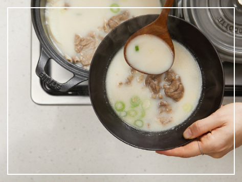 뼈 육수는 소, 돼지, 닭 등의 뼈를 오랜 시간 푹 끓여서 만든 국물로 콜라겐의 보고라고 할 수 있어요. 뼈를 장시간 고아내면 뼈 속 콜라겐이 젤라틴 형태로 변하면서 국물에 녹아나오는데, 이렇게 추출된 콜라겐은 체내 흡수율이 높아져서 효과적으로 몸에 흡수된답니다.