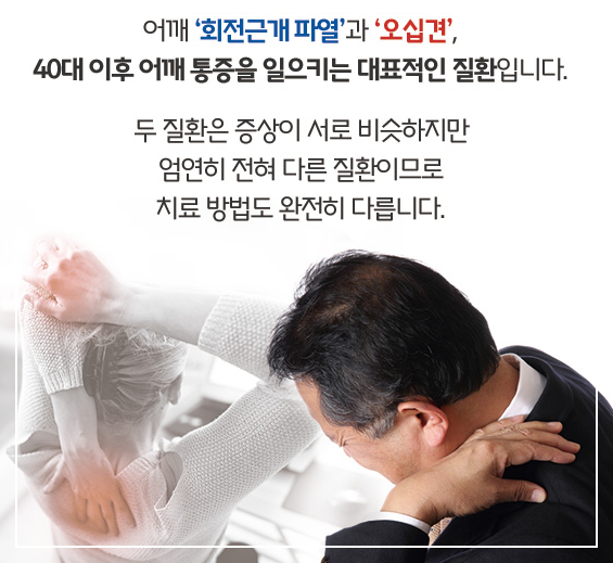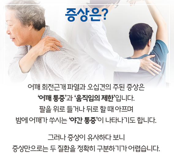 통증 때문에 움직임을 피하게 되면서 점차 관절이 굳어지고, 이것이 다시 운동 범위를 더욱 제한하는 악순환이 생기기도 해요. 오십견과 달리 회전근개파열은 스스로 움직이는 능동적 운동은 제한되지만, 다른 사람이 도와주는 수동적 운동은 비교적 가능한 경우가 많다는 점이 특징이에요.